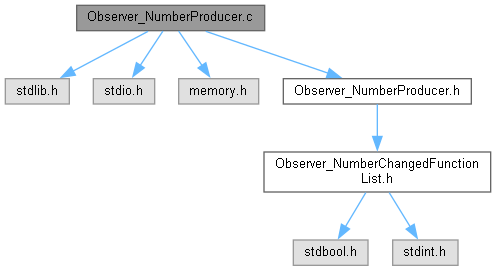 Declaration of the NumberProducer structure along with its support functions, NumberProducer_Create(), NumberProducer_Destroy(), NumberProducer_SubscribeToNumberChanged(), NumberProducer_UnsubscribeFromNumberChanged(), and NumberProducer_UpdateNumber(), as used in the Observer Pattern.
