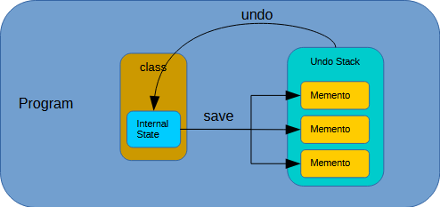 The client asks an object for a snapshot of the object's internal state. This snapshot is in an opaque form. The client typically caches this snapshot for later use (such as restoring the state to a known good state or as part of the process of implementing an undo system). When the client wants to restore the object's state, it passed the snapshot back to the object and the object changes its internal state to match the given snapshot.