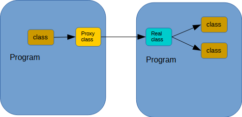 The key to the proxy class is it has the same interface (methods) as the "real" class. All calls made to the proxy class are forwarded to the "real" class. As far as the local program is concerned, the proxy class is the real class because the two classes look and act the same.
